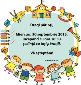 Miercuri, 30 septembrie 2015, începând cu ora 16:30, are loc la sediul Grădiniței „Fericitul Ieremia”ședință cu toți părinții copiilor înscriși în anul școlar 2015-2016.