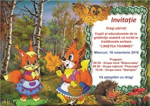Miercuri, 16 noiembrie 2016, copiii împreună cu doamnele educatoare de la Grădinița „Fericitul Ieremia” au deosebita plăcere de a vă invita la serbarea tradiționala serbare „Liniștea Toamnei”!